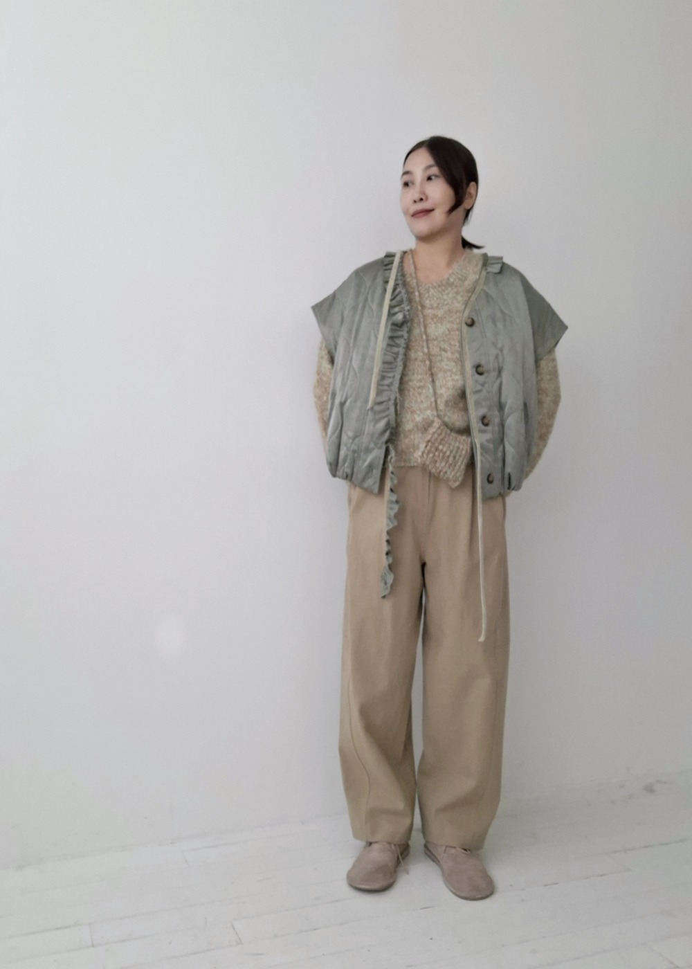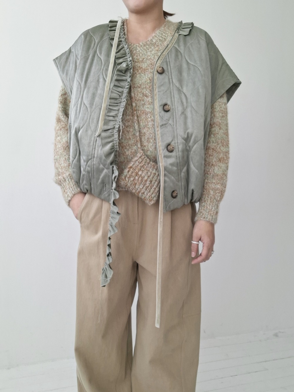 CARE: 使用洗衣機時,請務必使用羊毛清潔模式, 使用 <洗衣網> 單獨冷水洗, 避免將深色衣物與淺色衣物混合洗滌, 平鋪晾乾