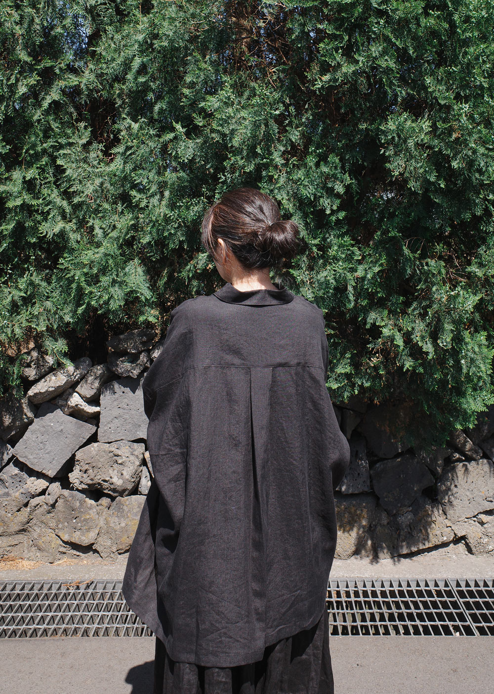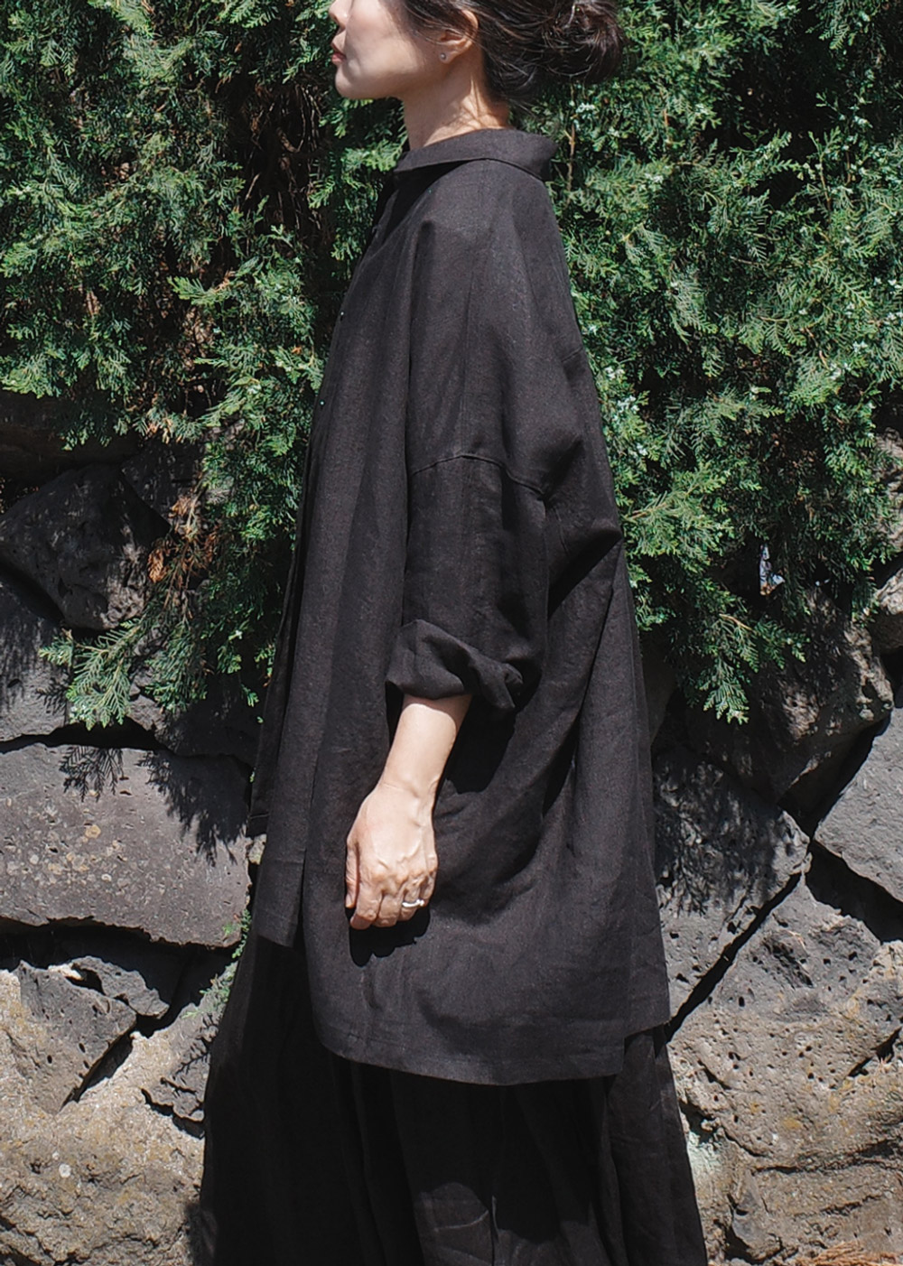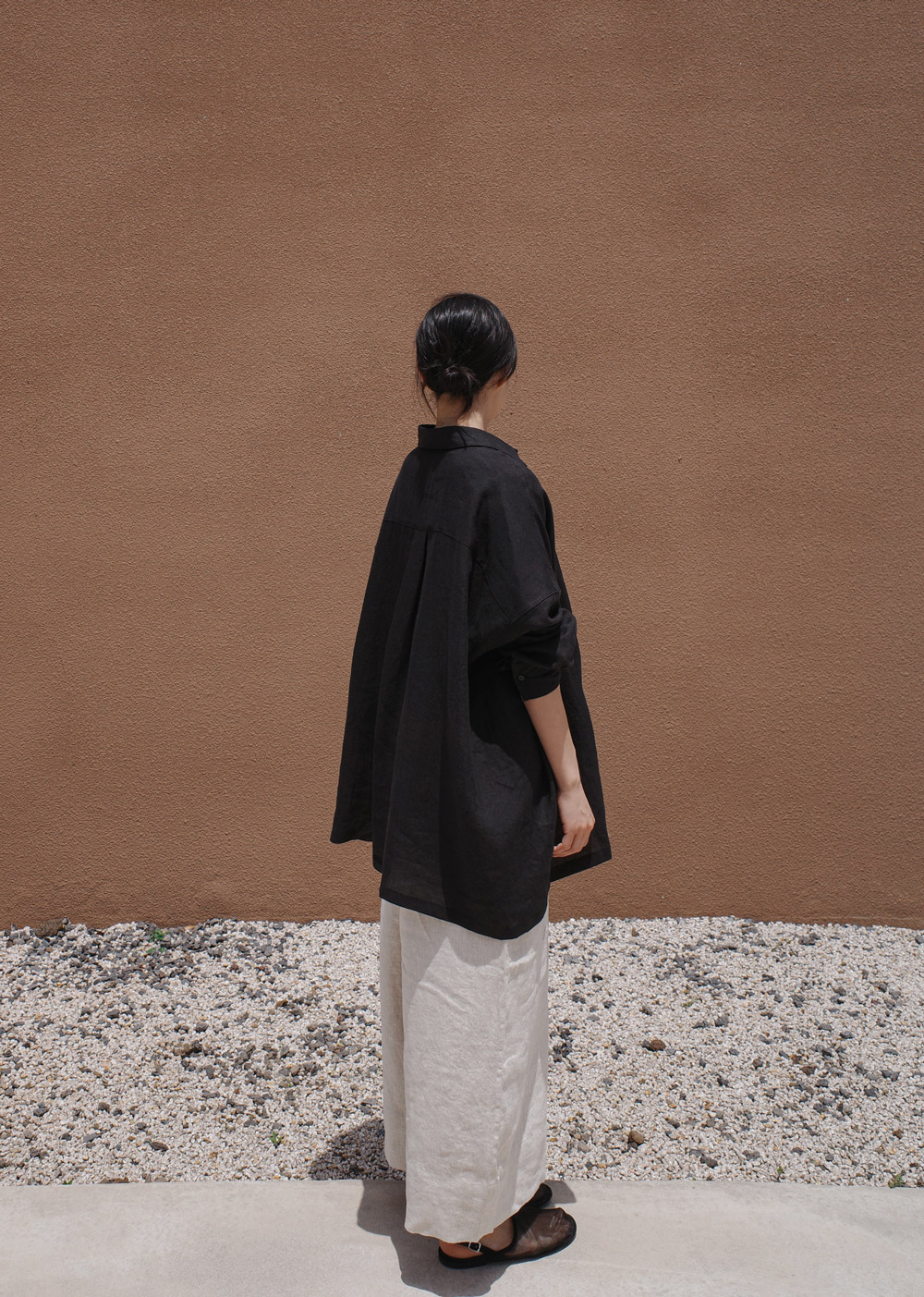 This is the first shirt to be introduced by Maylinen. This shirt stands out for its flowing, elegant silhouette. We chose a delicate linen fabric with a firm texture that is cool to wear and has a rustling feel. The ample oversized fit that covers the hips makes it suitable as a summer coat. The design is simple and clean, with minimal details and a moderate shirt collar.