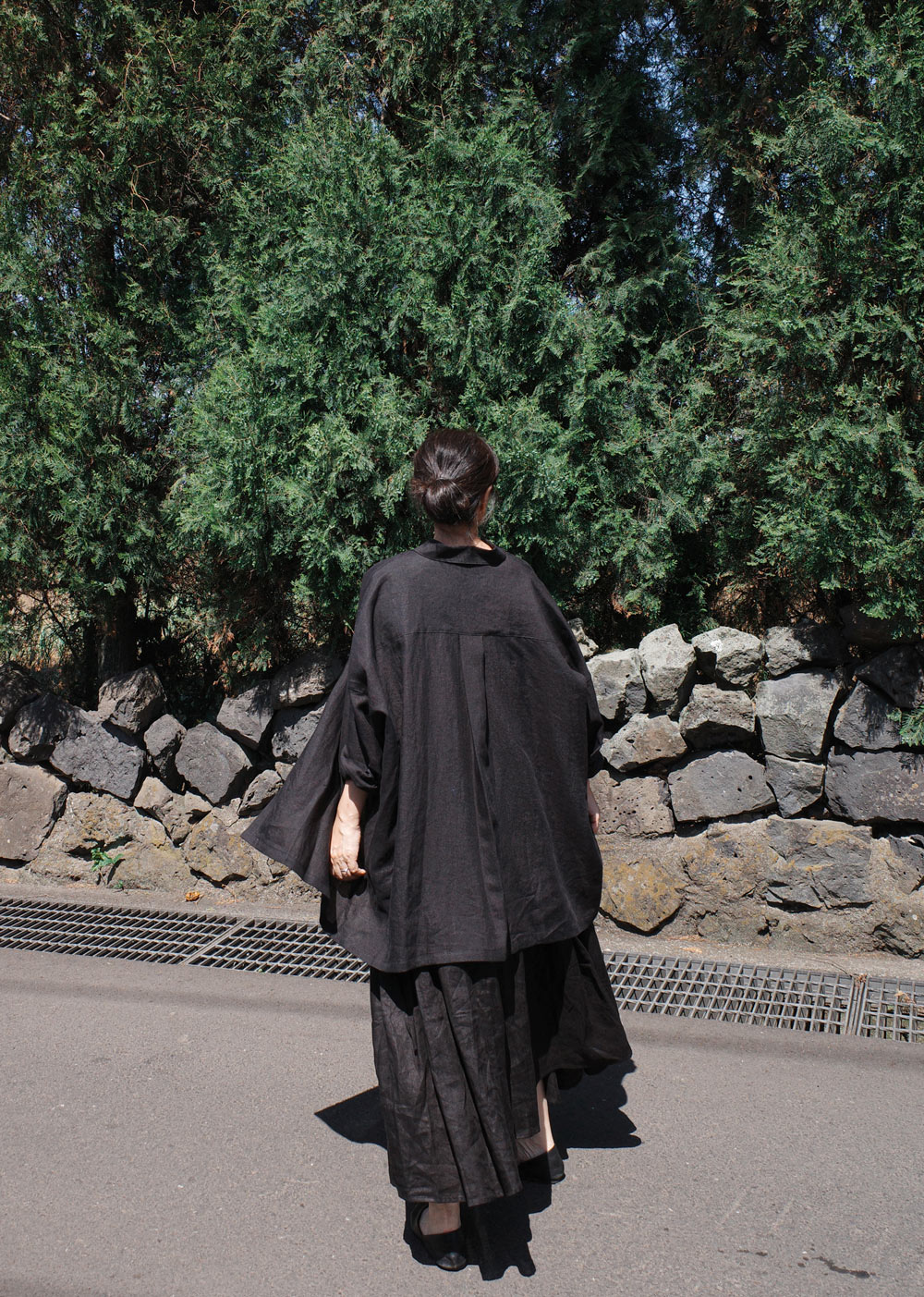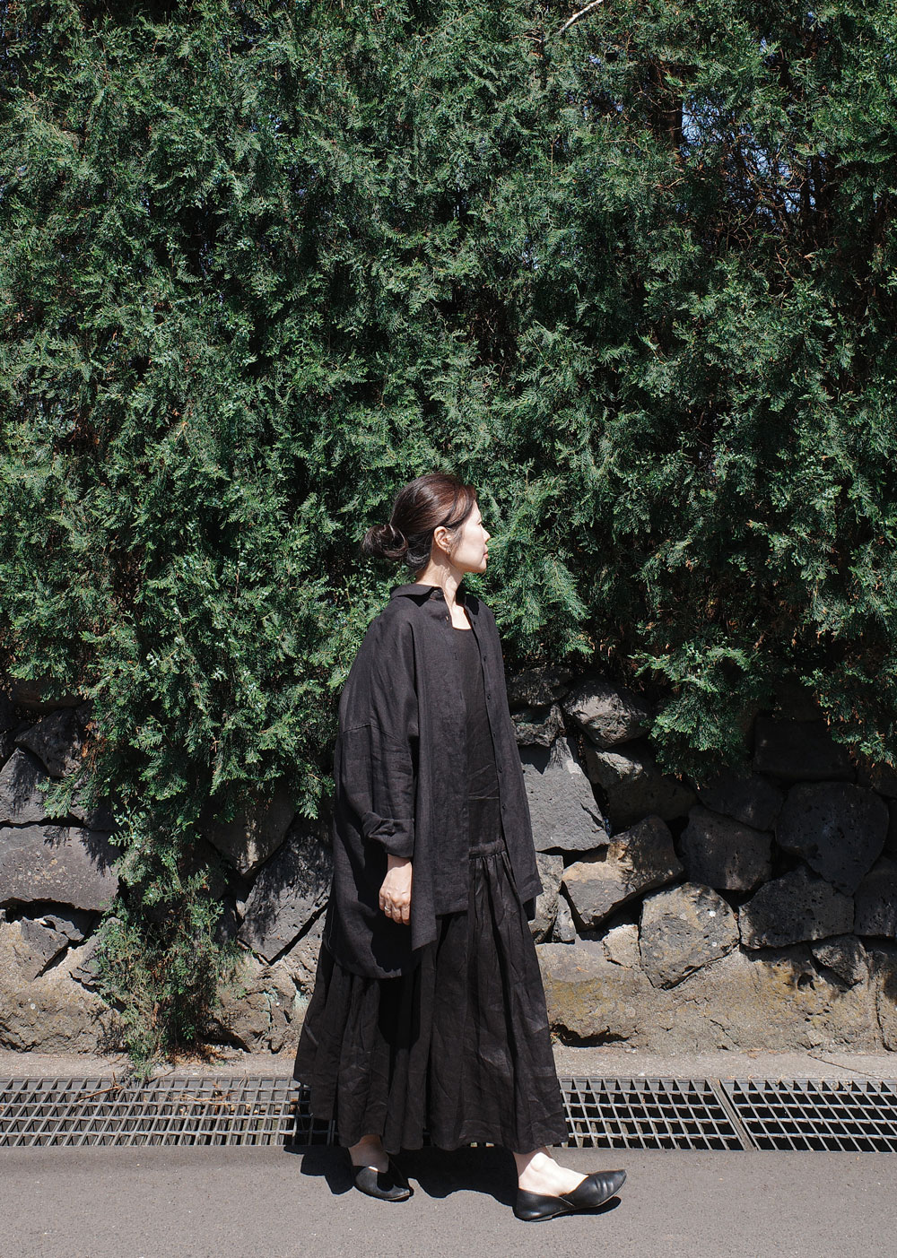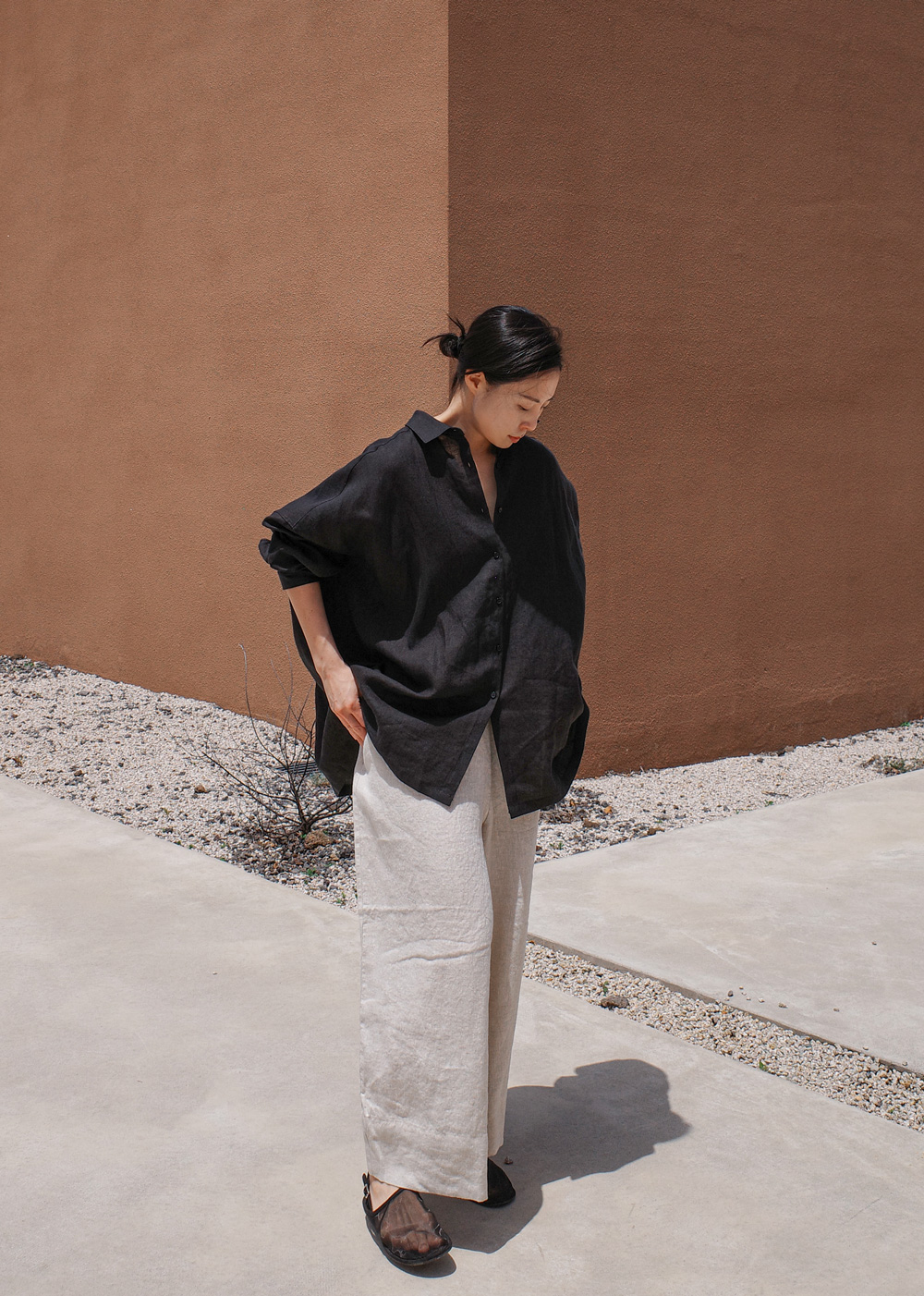 This is the first shirt to be introduced by Maylinen. This shirt stands out for its flowing, elegant silhouette. We chose a delicate linen fabric with a firm texture that is cool to wear and has a rustling feel. The ample oversized fit that covers the hips makes it suitable as a summer coat. The design is simple and clean, with minimal details and a moderate shirt collar.